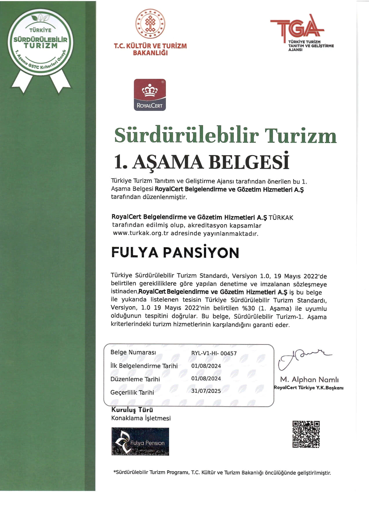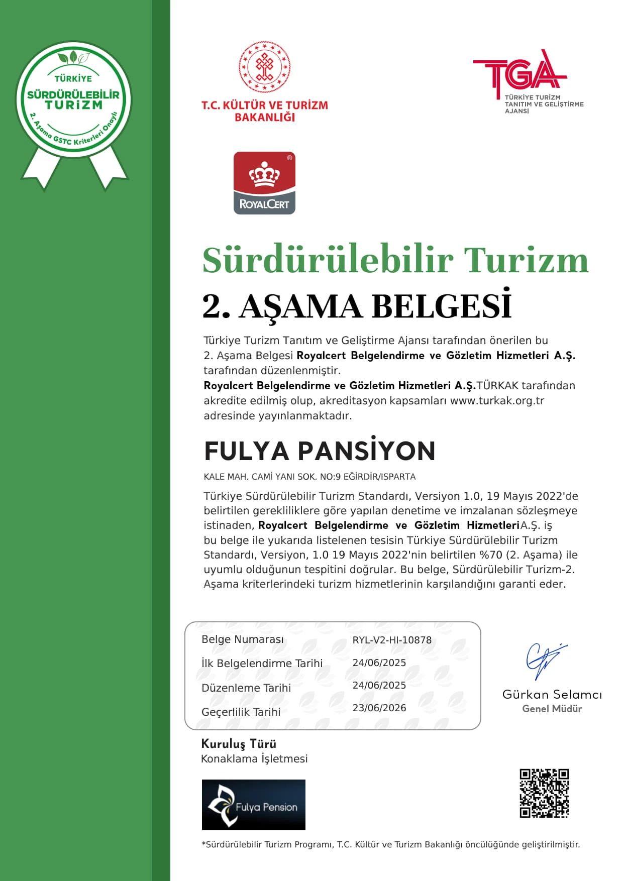 Fulya Pansiyon, T.C. Kültür ve Turizm Bakanlığı ile Türkiye Turizm Tanıtım ve Geliştirme Ajansı tarafından yürütülen Sürdürülebilir Turizm Programı kapsamında 2. Aşama Belgesi almaya hak kazanmıştır. Bu belge, çevreye duyarlı konaklama, yerel ekonomi desteği ve enerji verimliliği alanlarında gösterilen özeni tesciller.